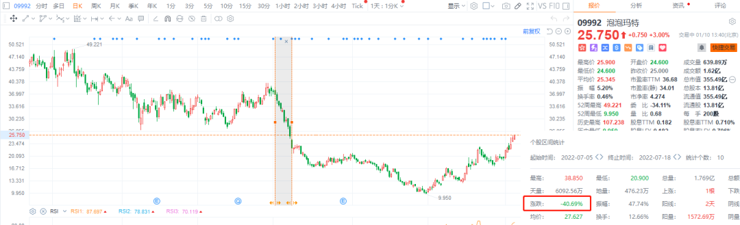 2022年7月15日,泡泡玛特发布盈警公告称,2022年上半年可能较2021年同期增长不低于30%,预期集团净利润将减少不超过35%,这使得泡泡玛特陷入恐慌下跌,10个交易日跌去40%。