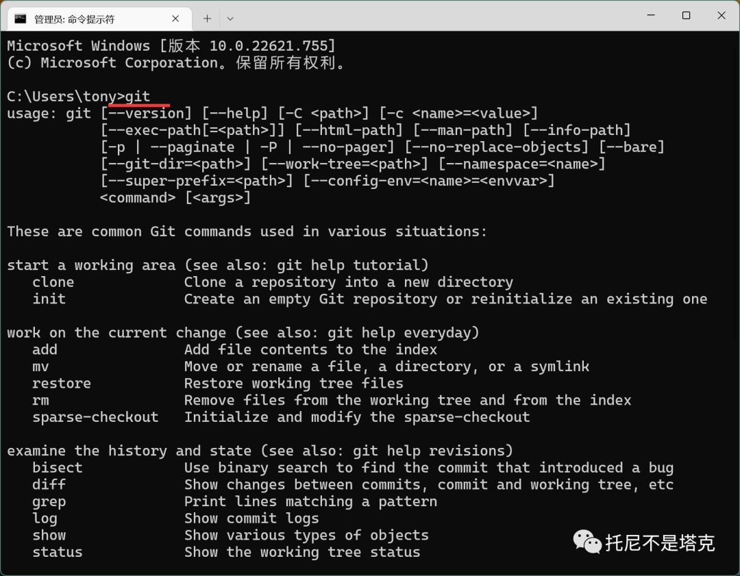 如果安装成功了,就会出现很多内容。显示了git的命令格式,以及可用的命令。
