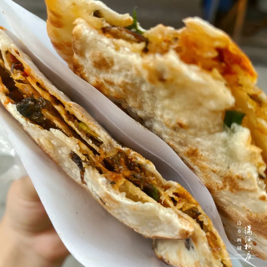 这家葱饼店不知道承包了多少桐庐人的早餐、和下午茶时光。咸香的猪油粒混合着葱香味、芝麻香,酥酥脆脆,葱香味十足,还有芝麻甜饼和梅干菜饼口味的。夹上一根无铝油条,再配上一碗咸豆浆简直是碳水炸弹,这样的早晨实在太快乐了。在桐庐一直都很火绿豆饼,店主是一位老爷爷,已经开了13年了。刚出炉时候,好远就能闻到绿豆饼的香味,真的太诱人了,就像爷爷说的:闻得到的香味,吃得到的口味。饼拿在手上还热热的,吃起来饼皮酥脆,馅料粉糯,带有淡淡的绿豆清香,不腻口,甜度适中,平时吃一个就会觉得腻的糕点,在这里似乎一个接着一个,根本停不下来。店里没有位置哦,有一个小小的玻璃橱窗,装满了烤好的绿豆饼,周围的街坊邻居都是即买,即吃的哦~八毛钱一个~擀好面皮后铺上一层肉沫,再放上灵魂香葱,压扁后放到锅里煎至两面金黄,最后往褶子口里倒入鸡蛋液。做好的鸡蛋饼外皮金黄酥脆,里面红、绿、黄、白相见,真的很诱人。江北一小对面的太平弄可不一般,里面的弄堂面馆、巧口砂锅,还有燕子烧饼,一到饭点小小的弄堂就挤满了人。