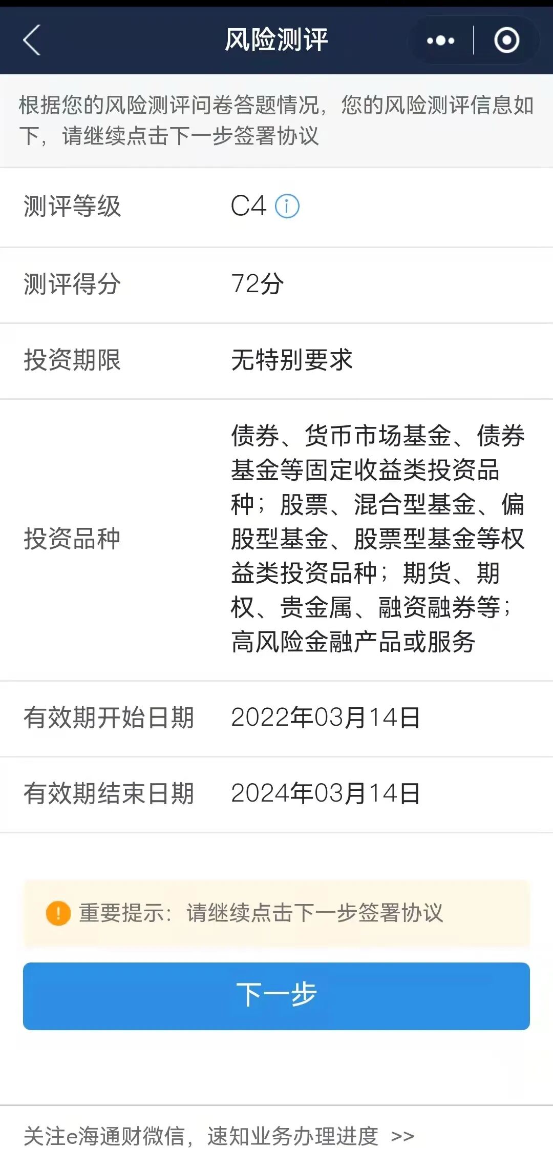 您可通过“业务办理—风险测评”自助完成风险测评。根据实际情况选择答案进行答题,完成后进入结果确认页面并签署协议。![]()