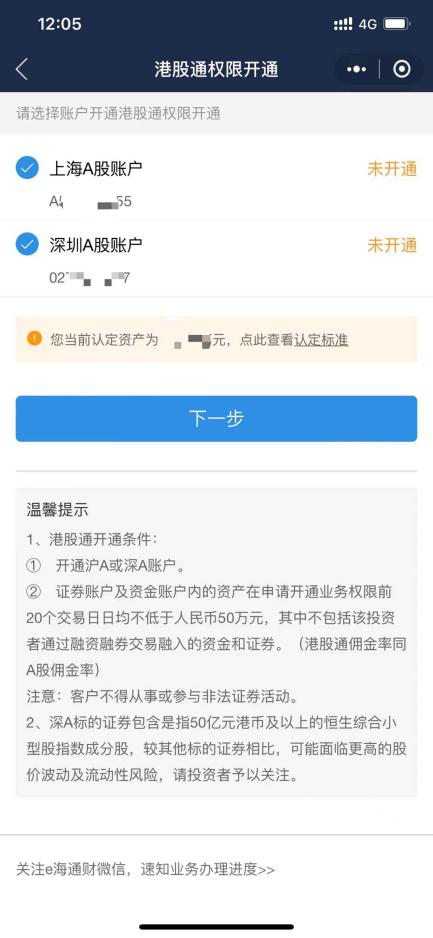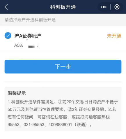 点击科创板开通,在满足开通条件的前提下进行自助办理。1)申请权限开通前20个交易日证券账户及资金账户内的资产日均不低于人民币50万元(不包括该投资者通过融资融券融入的资金和证券);![]()