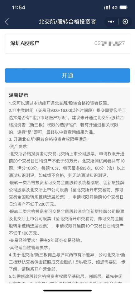 点击我的-权限管理-北交所/股转合格投资者,支持北交所合格投资者、股转一类合格投资者、股转二类合格投资者权限开通。![]()