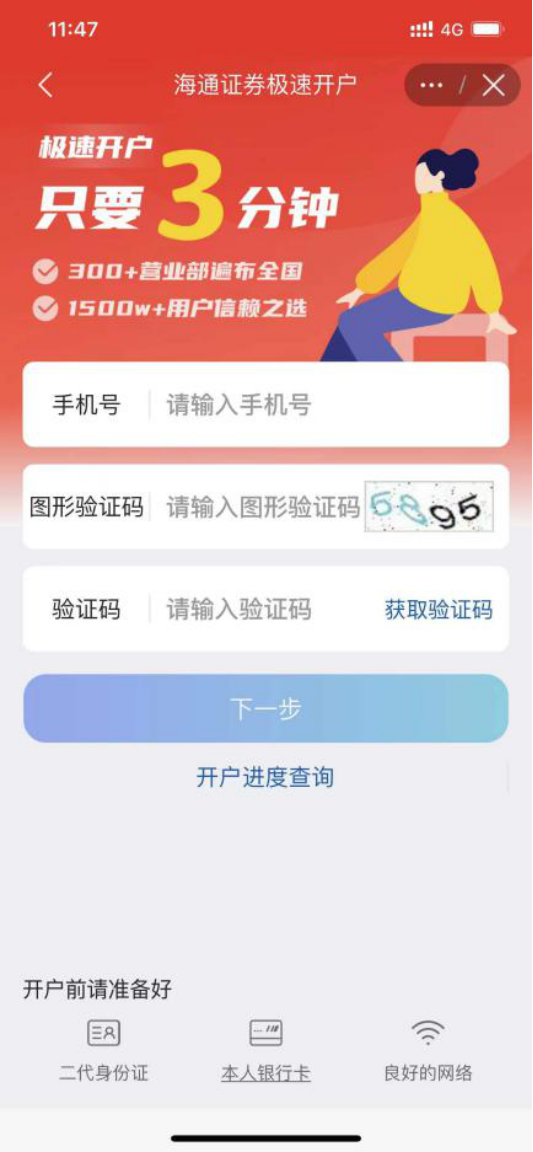 打开APP我的—我要开户。请在开户前准备好个人身份证、银行卡,在网络稳定的环境下进入开户流程。![]()