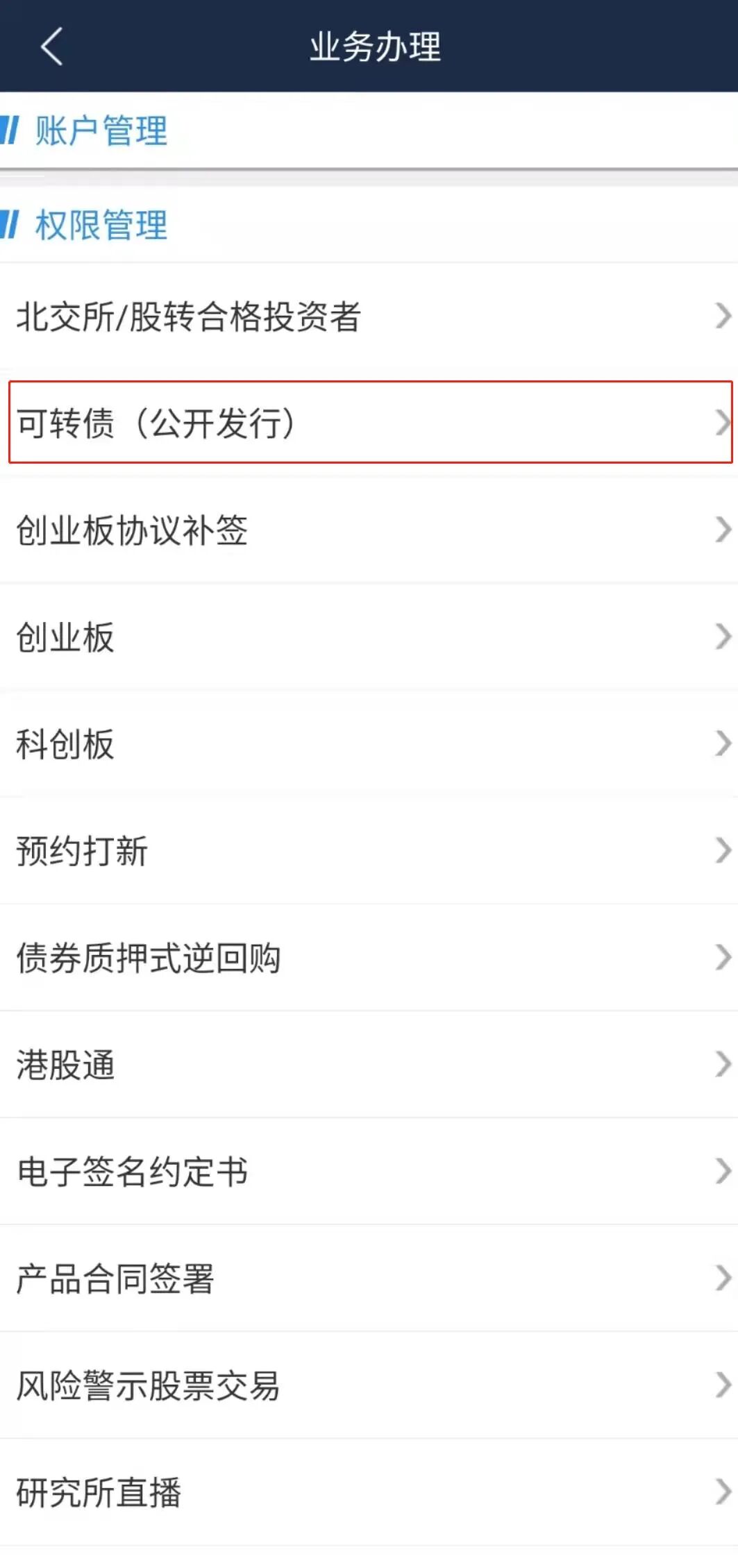 打开e海通财APP-【我的】-【业务办理】-【权限管理】-【可转债(公开发行)】