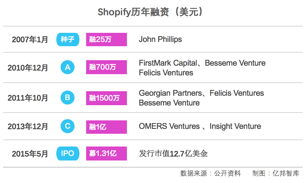 、Georgian Partners等机构两轮总计2200元美元投资。资本加持下,围绕中小商户建站需求和开店的支付、物流、营销需求,Shopify开始扩大服务产品,并于2014年营收突破1亿美元大关。