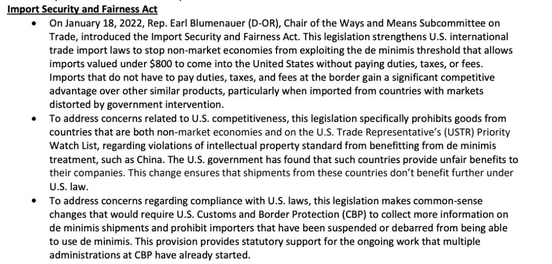 2016年的“48改革”,让跨境电商进口彻底告别免税时代。部分靠烧钱起家的跨境电商平台从不可一世,到被迫转型,再到销声匿迹,不足半年。“早晚的事!”深圳卖家陈鸿升已经开始考虑转让亚马逊店铺,“这股风暴就比如5年前的跨境电商进口,没有了税收红利,一切先发优势都被抹平。”而陈鸿升口中的先发优势,具体而言就是价格优势。中国跨境出海卖家的小包裹,定价策略更低廉,手段也更灵活,同时抗风险性也较强。所谓直邮小包模式,是跨境电商主要的物流方式之一。通常指顾客下单后,货物从国内直发到国外,不使用本地仓储、尤受销售轻小件的卖家欢迎——既可降低成本,也少了前置备货的风险。曾有业内统计显示,约有80%的独立站卖家使用直邮小包的模式。同时,在亚马逊、eBay、速卖通、Wish等平台,也有部分卖家使用该物流方式。据悉,美国众议院及参议院以高票通过了该份中国企业为主要“限制对象”的《2022美国竞争法案》。其中《 进口安全和公平法》(Import Security and Fairness Act)做出了明确要求。![]()