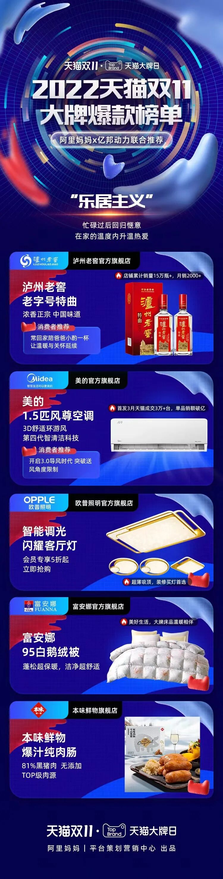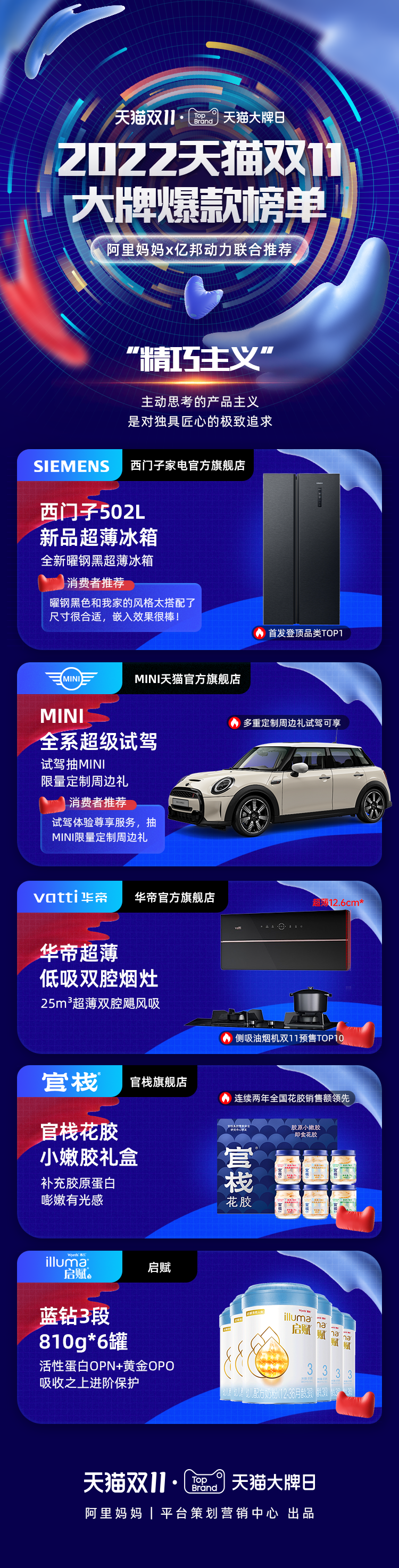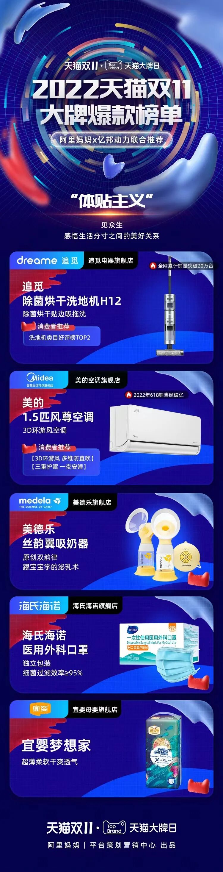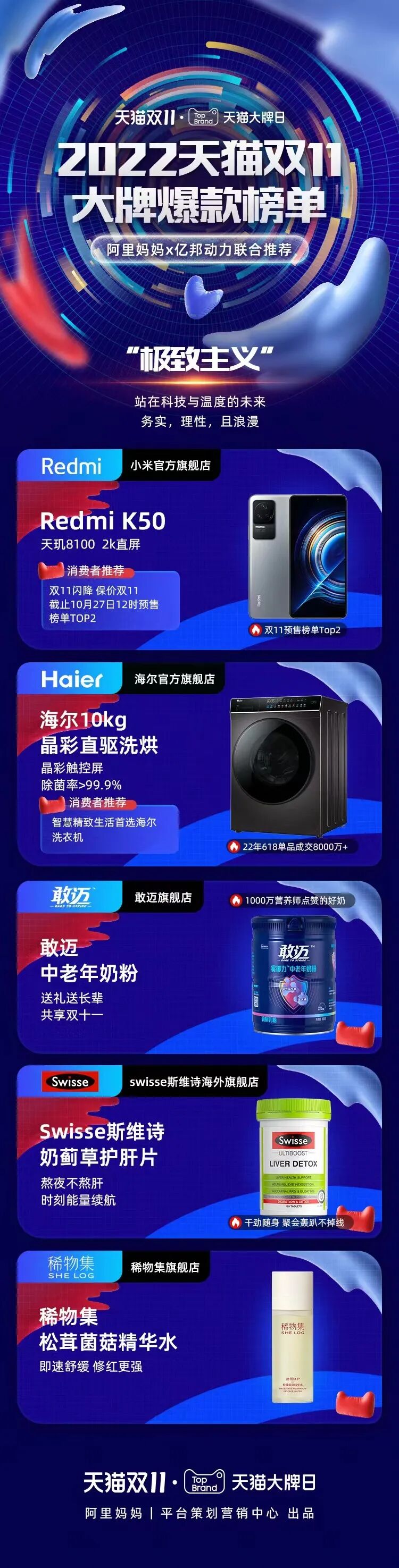 每一年的天猫双11不仅是一次品牌事件和消费集中的爆发点,也是整个电商行业变化革新的一个缩影。但往往就在亲临紧张激烈的备战阶段,品牌容易陷入一个困局:「如何打造爆款产品?」爆品对于品牌的重要意义,不言而喻;爆品打造的背后是洞察,而洞察的背后是数据。如何让精准的洞察力与超强的爆品打造能力得到延续?针对品牌这些共同的“痛点”诉求,阿里妈妈平台营销策划中心推出“双11大牌爆款计划”,意在通过整合淘内外流量场域和专属经营特权,以付费撬动免费,并联合亿邦动力发布《2022天猫双11大牌爆款》榜单,以帮助品牌逐步实现“经营人群+货品资产”的长效全域蓄力,助力超级大牌领先抢跑双11,打造行业头部爆款。其中,海尔470L超薄全变温冰箱预售期登上天猫双榜单TOP1,OPPO reno8系列斩获天猫价位段预售榜单TOP3,珀莱雅早C晚A套组双11达人直播间迅速售罄等,这些亮点表现都在揭露消费者对爆款的绝对信任与反馈。今年在多重因素的影响下,消费者的心态也发生了一些变化,并呈现出新的消费趋势。阿里妈妈通过洞察研究,总结出「下半年三大消费特征:越来越多人希望通过消费去消解不确定性,打造多元化宅家体验,探寻极致化户外生活。」基于这些消费特征,接下来有「六大消费新趋势」值得关注:首先是为了消解不确定性,人们开始追求生存掌控和提前备货,让冰箱/冷柜等品类迅速增长,今年上半年全国多个城市大容量冰箱成交额相较2020年同期增长437%;同时,健康理念成为新生活方式,消毒类、净化类产品开始渗透到消费者生活的方方面面,例如今年上海的空气消毒机同比增长差额达到6643%。而伴随着宅家新文化的出现,带来宅家健身、娱乐相关品类的迅速增长,例如今年北京K歌/直播声卡套装同比增长达到531%,甩脂机/小肌肉群类运动器材同比增长99%;与此同时,悦己主义的消费趋势更加明显,香薰用品等提升生活品质的品类迎来增长;在口味方面的追求也有所升级,酒水等满足口舌之欲的品类,以及相关联的各种小家电品类都攀升迅猛,宅家也要享受食物带来的欢愉体验。当然,随着人们走出去享受生活的意愿更强,也开始追寻自驾带来的体验,今年上半年,露营相关商品成交额相较于2020年同期增长458%;也有很多消费者,开始迷恋冰球/速滑/冰上运动等追求突破自我的新兴运动,相关品类在今年上半年同比增长259%,带动运动服饰也保持高速增长,例如羽毛球鞋同比增长145%。也正是在新的消费趋势、新的经营节奏下,品牌商家开始重新思考经营节奏和经营策略,寻找确定性机会。今年双11,阿里妈妈平台营销策划中心推出的大牌爆款榜单以“为爱充能”为主题,联合40余个品牌,围绕“极致主义”、“精巧主义”、“自在主义”、“悦己主义”、“体贴主义”、“颜值主义”、“品味主义”和“乐居主义”细分出八类榜单,分别从科技、产品、自信、生活等维度评选出双11最亮眼的爆款榜单。
