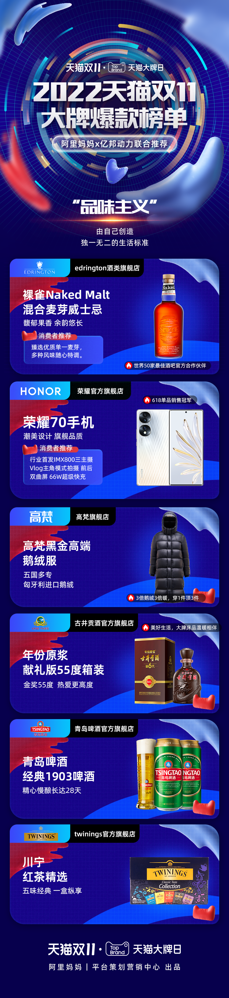 大牌爆款榜单聚焦数码家电、美妆护肤、酒水食品、汽车、生活家居等主要品类,以最新视角洞察消费者偏好,捕捉品牌爆款潜力趋势,也为今年消费市场带来更多导向和指引。强化日常经营、注重经营的多目标增长已经成为商家经营的大势所趋。过去的7-9月,对于商家来说是非常重要的平蓄期生意周期,而双11则是蓄水的关键,也是打爆品的关键时刻。“平蓄促收”是阿里妈妈今年看到的核心增长机会,但具体到不同行业,“平蓄期”的经营重点各不相同。阿里妈妈平台营销策划中心,从日销期开始关注商家爆款蓄能,推出天猫大牌日、大牌上新日、集团日等经营计划,与平台百余商家达成合作。针对全域人群蓄水,阿里妈妈提供了一站式全域蓄水工具,可以帮商家打通站外种草及站内高效承接全链路。作为强调爆品能力的美妆行业,阿里妈妈将围绕货品的全生命周期,提供不同的产品能力和运营计划,加速商家在爆品的几何式成交爆发。并应用日销经营计划和平台大促,帮助美妆行业商家打造品牌及单品声量。以国货护肤品牌珀莱雅为例,它就紧紧抓住了店播风口,通过打造高效转化的直播间,实现了早C晚A的品牌爆款单品,成为国内首先推出氧糖双抗概念的护肤品牌。珀莱雅曾经在直播时遇到了引流难题,于是品牌通过超级直播进行拉新引流,同时将直播间、看点和短视频联动组合投放,完成了高效渗透与精准收割。针对非标品类具有应季性、受风格驱动等特点,「要让“货”火出圈成为爆品,首先就是要快速找到消费者沟通语境,通过内容种草快速爆品出圈形成口碑效应。」以运动品牌FILA为例,在猫爪 FLUID 4代运动鞋的爆款打造过程中,以优质短视频内容表达其经典仿生猫爪元素、鞋底TECNO-PIUMAX轻能发泡材质时尚穿搭宝藏单品等核心卖点,激活用户消费兴趣。「通过超级短视频投放,达到前期种草效果,沉淀品牌人群。」而以坚持多元化审美的UR,通过满足新生代时尚先锋多元社交场景、多角色自由切换的着装需求,引领年轻人追逐的爆款穿搭风格。高客单、低复购、长决策周期,消费电子行业在营销上的挑战在于,每一轮新品发布都面临着很重的“拉新”任务,必须「精准触达高潜新客、加速首购转化。」因而,阿里妈妈将为消费电子行业定制“滤波式”营销解决方案,快速锁定品牌高潜人群,持续曝光、一举打爆。以竞争白热化的手机行业为例。OPPO是阿里妈妈的深度合作伙伴,自2021年开始,双方联合搭建了长周期人群运营评估体系,2022年,又在人群运营的基础上加入货品运营,利用算法能力实现人群“固本+破圈”。OPPO与天猫大牌日、大牌上新日全年6次以上的高频合作,频繁发新打爆。2022年5月,OPPO发布年度主力机型Reno8系列,开售10分钟全网销售额破亿。7月大牌上新日发布“鸢尾紫”新配色,焕新产品消费体验。在双11大牌爆款计划专项中,OPPO继续深耕爆款,通过阿里妈妈的达摩盘数智运营工具,挖掘品牌的忠实粉丝以及可能发生首购、复购的潜在换机人群,确保Reno8系列的爆款成交表现。酒水行业作为一个充分竞争的行业,品类之下同场竞技的品牌极多。消费者决策周期短,容易冲动下单,购买前容易被抢单、而购后排他性强。因此对于酒水行业来说,创造性的品牌往往能带动细分市场爆发性的发展,那些满足了消费者需求的产品也有机会持续成长为现象级爆款,为品牌长效经营保障供给。这其中,来自爱丁顿集团的裸雀威士忌品牌,臻选多种优质单一麦芽威士忌混合而成,Oloroso初填雪莉桶陈年,馥郁果香多种风味随心特调,能够满足消费者对威士忌的高品质追求;同时揽获多个国际奖项,成为世界50家最佳酒吧官方威士忌合作伙伴。爱丁顿今年双11将通过阿里妈妈广告投放能力精准触达核心消费群体,蓄力打造线上成交高峰。