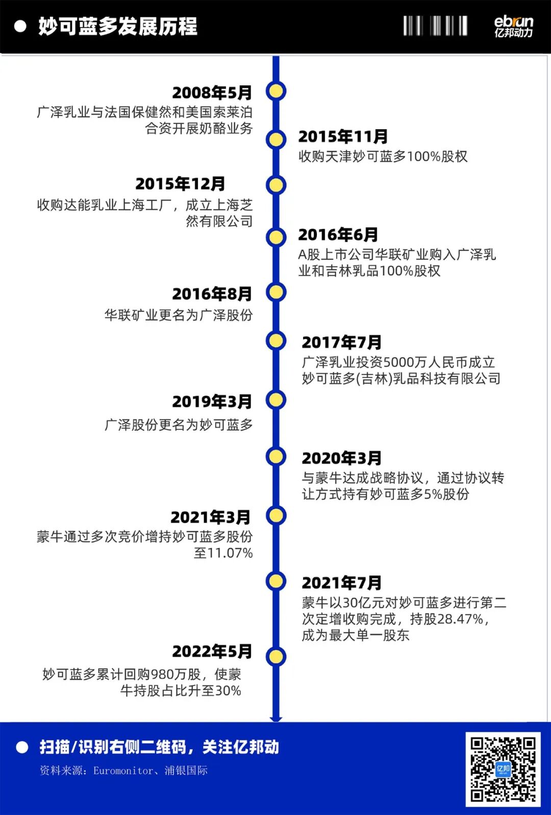 2022年10月9日晚间,妙可蓝多发布公告称,其控股股东蒙牛乳业拟以30.92元/股要约收购妙可蓝多5%股份,本次要约收购所需最高资金总额为7.98亿元。这已经是蒙牛的四度出手了。前三次,分别是2020年1月,蒙牛作为战略投资方,以14元/股作价2.87亿元受让妙可蓝多5%股份,同时以4.58亿元增资入股妙可蓝多的全资子公司广泽乳品;2021年,蒙牛又全额参与妙可蓝多30亿元定增,持股比例上升至28.46%;今年1月,蒙牛乳业又对妙可蓝多进行了增持,持股比例进一步提升至30%。如果,最新一次要约收购顺利完成,内蒙蒙牛将最多合计持有妙可蓝多1.8亿股股份,持股比例增至35%。每一家成功的消费企业都拥有一部并购史,坐拥八百多亿营收的蒙牛出资的逻辑不难理解,但于妙可蓝多而言,需要思考的更多。“居安思危、未雨绸缪,我总在思考:妙可蓝多可以飞多高走多远?妙可蓝多前进道路上还会有多少暗礁激流?如何才能让妙可蓝多在未来五年里更快、更稳健的发展?现阶段是自己单打独斗,还是借助更好的资源?”创始人柴琇致妙可蓝多家人的一封公开信里的种种思考,其实也是对这几年异军突起的新消费品牌之问。奶酪新消费的妙可蓝多、国货美妆里的完美日记、潮玩界的泡泡玛特、茶饮江湖的奈雪喜茶们,新人群、新营销、新渠道,让一众新消费品牌风光无两,坐上时代电梯的它们,究竟能走多远攀多高,如何才能垒起自己的供应链、渠道、品牌护城河。这些问题需要实践给出答案。新消费风口不再,马拉松长跑已启,而这场马拉松的难度,在乳业身上更为险峻。巨头对上游奶源的强大掌控力、全国性的渠道布局、远高于其他对手的市场投入,让中小乳企遥不可及,更非资本烧钱能短时间博弈而来。![]()