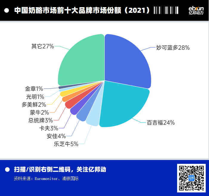 10多年前,《谁动了我的奶酪》成为畅销书。而放眼今天中国奶酪市场,可以肯定地说,是妙可蓝多“先动的手”。奶酪并非中国广谱消费者接受的食品。因此,2018年的中国奶酪零售市场中,百吉福、安佳、乐芝牛、卡夫、总统位列前五,清一色的国外品牌,排在第一位的百吉福市占率更是达到27.2%。转眼不到4年,妙可蓝多则凭借35.5%的市场率成为奶酪之王。其中,奶酪棒市场占有率超过40%。(数据来源:根据凯度消费者指数家庭样本组数据显示;时间统计维度:截至2022年上半年)除却乳企擅长的渠道铺货外,这几年妙可蓝多在线上的表现也很抢眼。2021年双11妙可蓝多斩获京东、天猫、抖音、拼多多各大平台品类冠军,在天猫平台一举揽得芝士新目类与奶酪目类双冠王,销售额同比增长138.59%。今年618大促期间,妙可蓝多依旧保持着奶酪黄油类目第一名的位置,累计GMV破亿元。双11期间,亿邦特别策划了“超品洞察”系列研究,选取全球众多品类赛道的优质消费品牌。这些品牌作为积极扛旗者,在商业实践中表现出的品类嗅觉、用户共情、产品信仰、品牌与数字化理解力等,无论褒贬,都有着显著的标杆意义,并对中国当下乃至未来消费行业、企业极具参考价值。这篇文章我们将聚焦奶酪赛道的代表品牌妙可蓝多,并试图为如下问题找到一些答案:- 在近600家区域乳企中,为什么是妙可蓝多杀出了重围?从发现缝隙到把握机遇,妙可蓝多都调动了哪些资源?