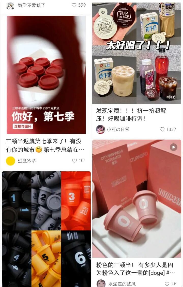 但这并不是三顿半俘获年轻人芳心的重要手段,最核心的在于其强大的内容制造能力,以下选择三点重点介绍。在小红书上,每天关于三顿半的新增笔记在5~7篇。在KOL选择上,三顿半倾向于选择粉丝数在1~10万的中腰部KOL。就内容而言,更贴近普通消费者的日常。就投放原则上,小红书避开了一般咖啡品牌围绕冷萃等进行口味升级宣传的窠臼,转而强调冻干技术带来的多元化场景。打开小红书,三顿半始终围绕的场景在办公室、家庭日常以及大学生的校园生活上。办公场景上,三顿半宣扬“打工人的3分钟快早餐”;家庭场景下,三顿半是家庭中的精品咖啡馆;学校里展现的则是三顿半物美价廉、适合学生族消费的一面。再比如三顿半备受推崇的返航计划”—将用户手中的咖啡杯回收并重新利用的长期活动,已是年轻人的社交秘钥。在小红书等社交平台上,不少人甚至会自发分享自己的返航之旅和兑换到的物资。无形中,返航计划助推了UGC(用户原创)内容的诞生。![]()