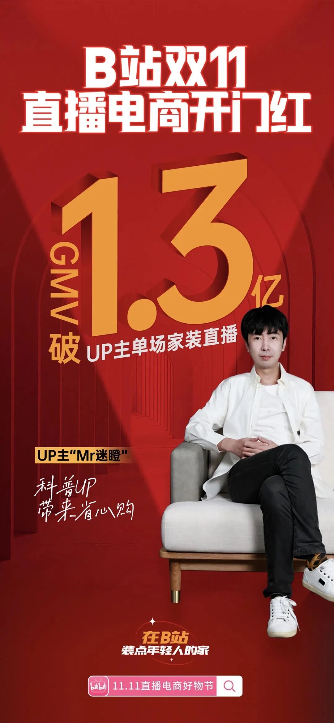 Mr迷瞪是以B站生活区为根基的家居家装科普UP主。他从今年三月开始尝试带货,到双11预购期的10月24日晚,他的单场带货GMV已达到1.3亿,截至11月6日的双11销售额达2.8亿。