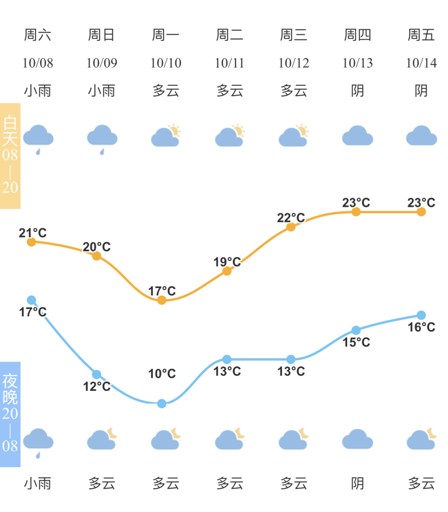 第三,这次冷空气带来的降温主要体现在最低气温上。10月10日开始,我市最低气温跌至10℃-13℃,其中,10月11日最低气温仅10℃左右。