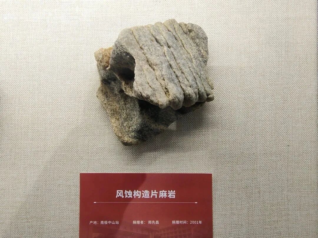 在“校友捐赠藏品展”,还有一块风蚀构造片麻岩标本,它同样产自南极,是由郑先昌博士2005年捐赠的。2004年10月,我校1987级校友郑先昌博士随中国南极第21次科考队赴南极,进行为期5个多月的科学考察。在南极期间他对我国两个站区冻土及建筑物冻融危害进行全面调查,这是我国第一次在南极地区进行工程地质勘探。同时,由他提出的利用“钢梁基础+地锚加固”的方法,在南极中山站实验取得成功,使我国南极站区首次利用风力发电,为南极站区建设作出了突出贡献。