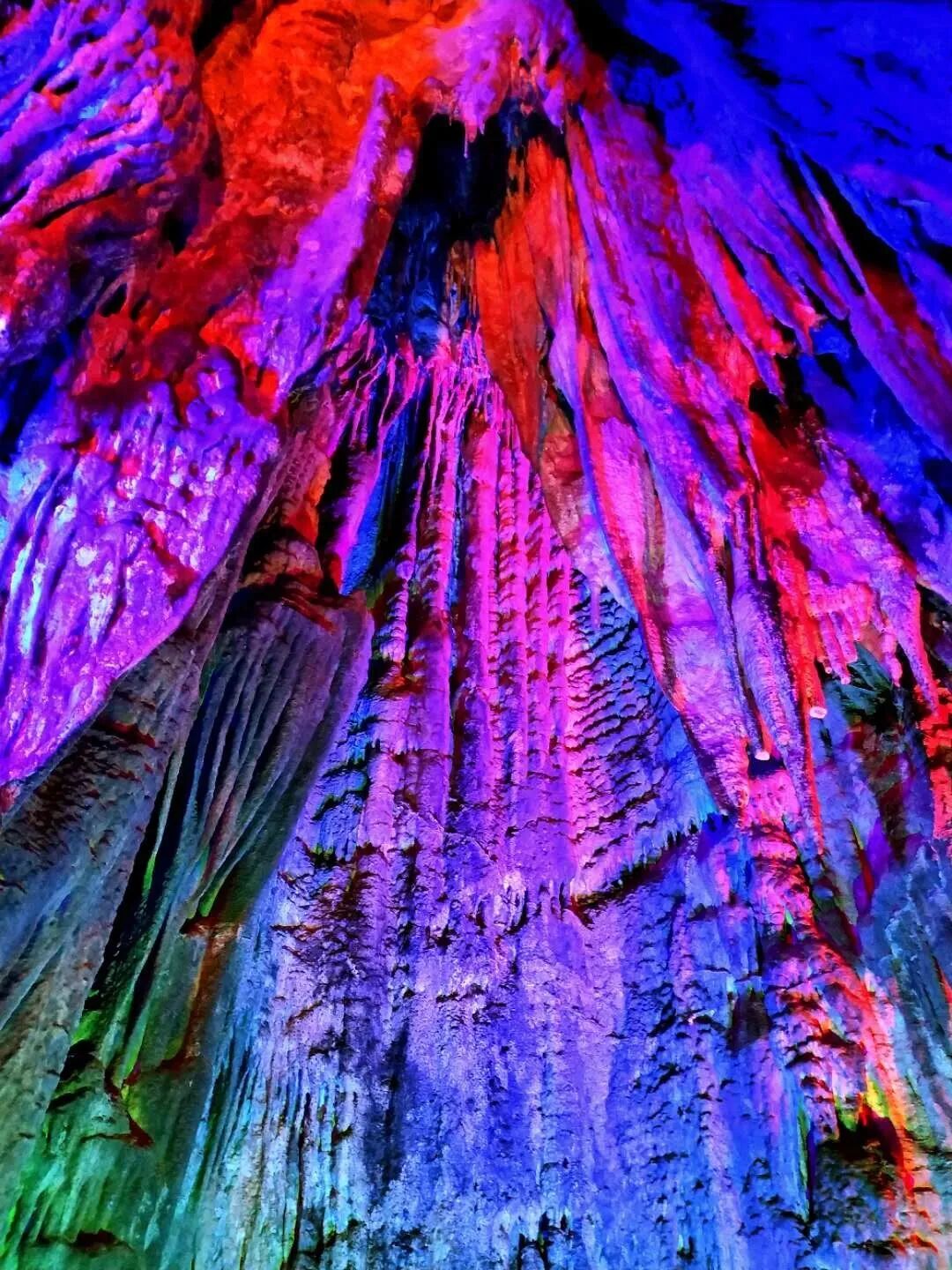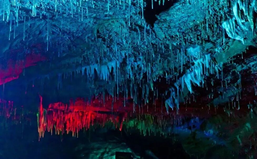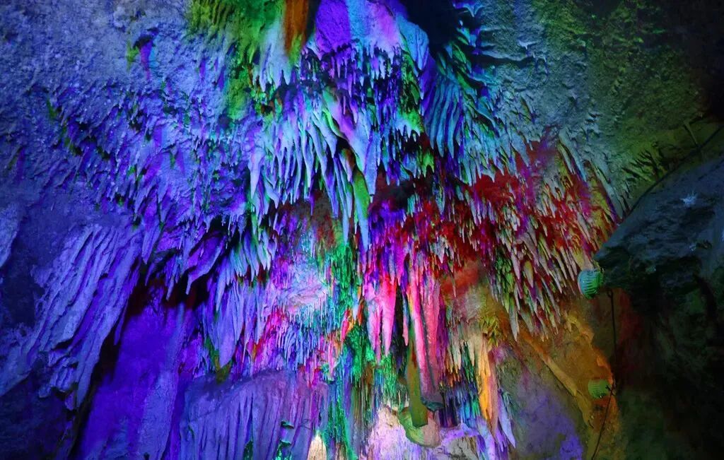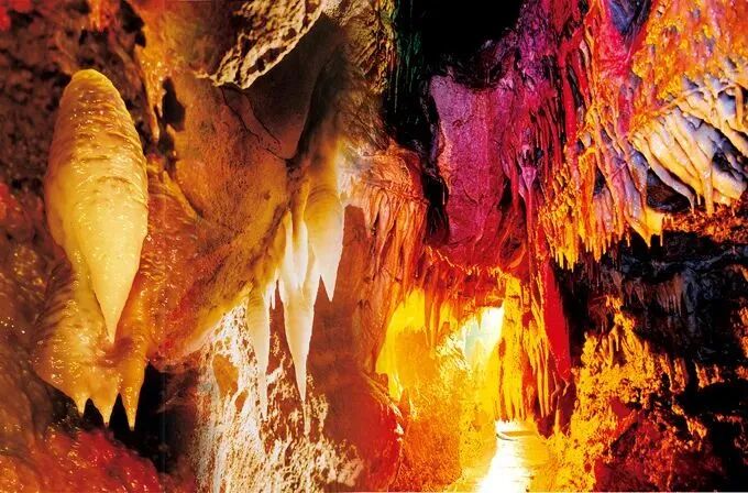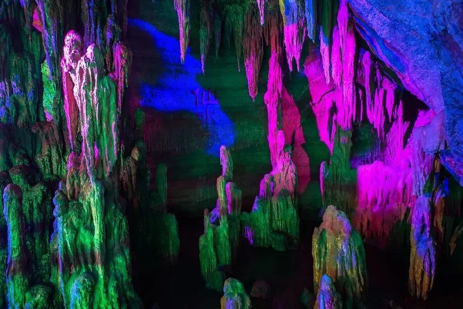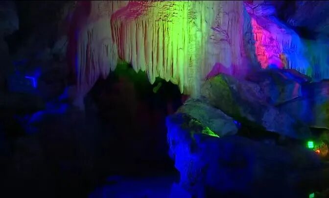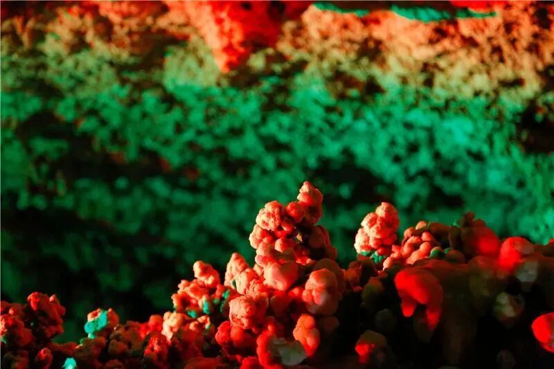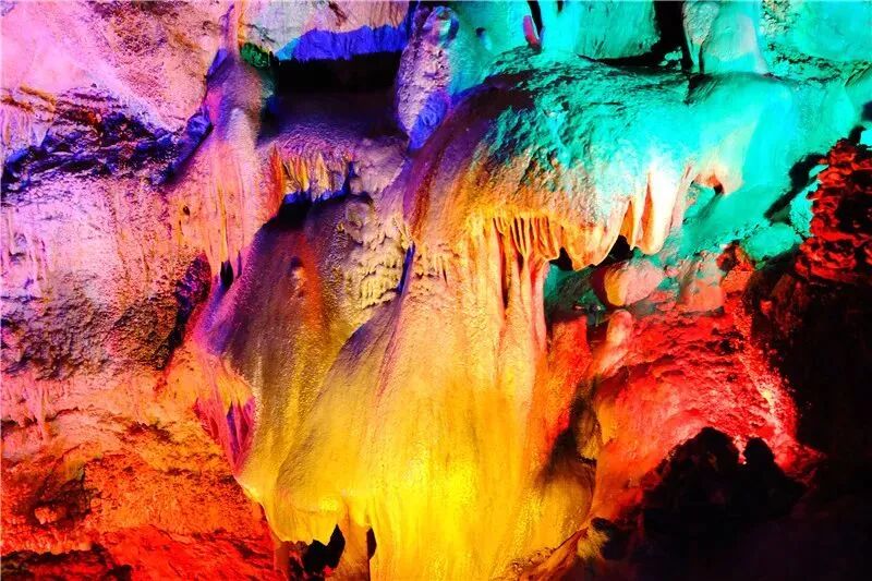 钟乳石经过上亿年冲刷,有的像飞鸟,有的像走兽,千差万别各自不同,在灯光的映衬下流光溢彩、千姿百态,如同一幅绚丽夺目的梦幻神奇画卷。
