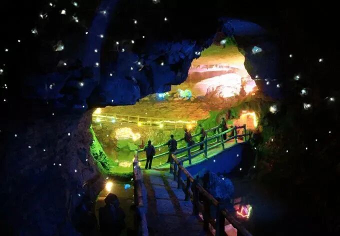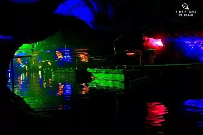 走进萤火虫水洞,乘上一叶由绳索牵引的轻舟,破水前行,前边豁然开朗,满天萤火虫和彩灯犹如繁星闪烁,熠熠生辉,犹如进入一个童话世界。