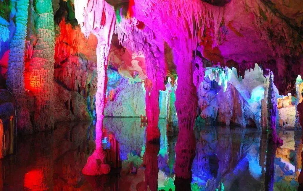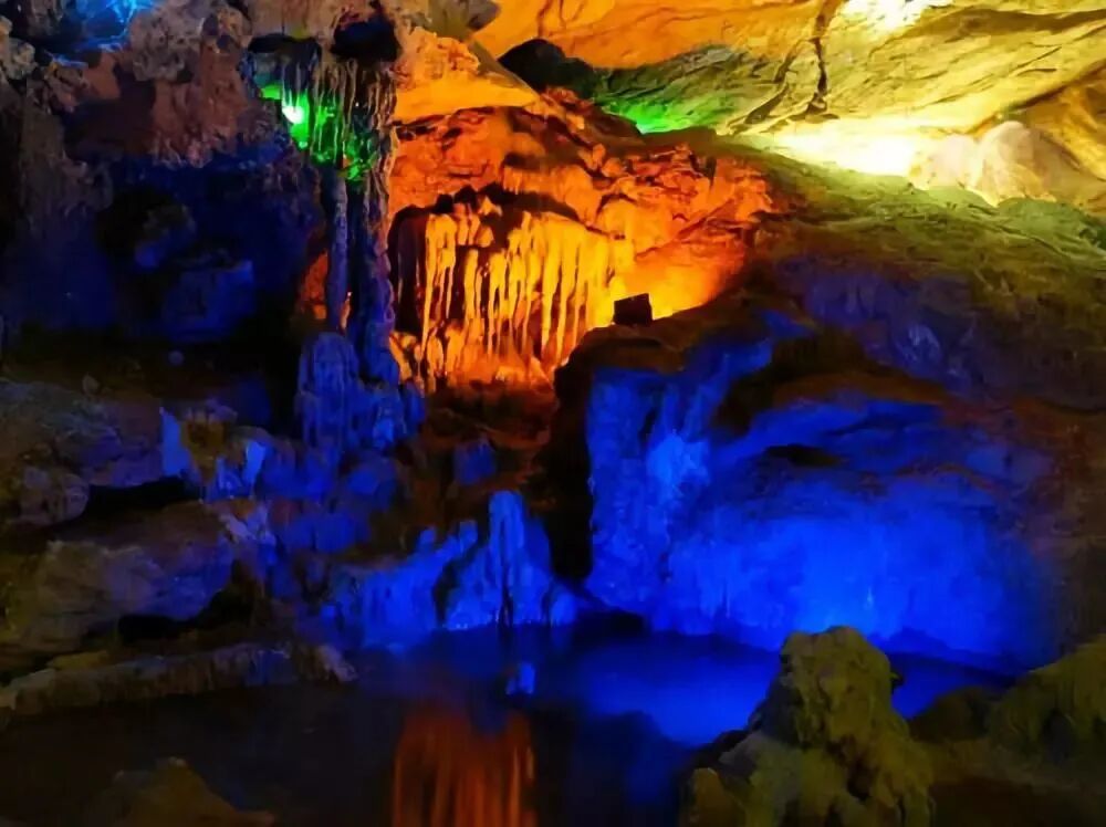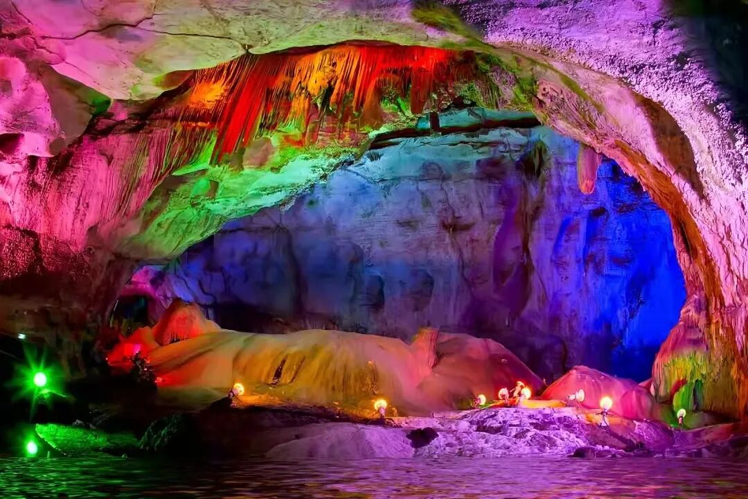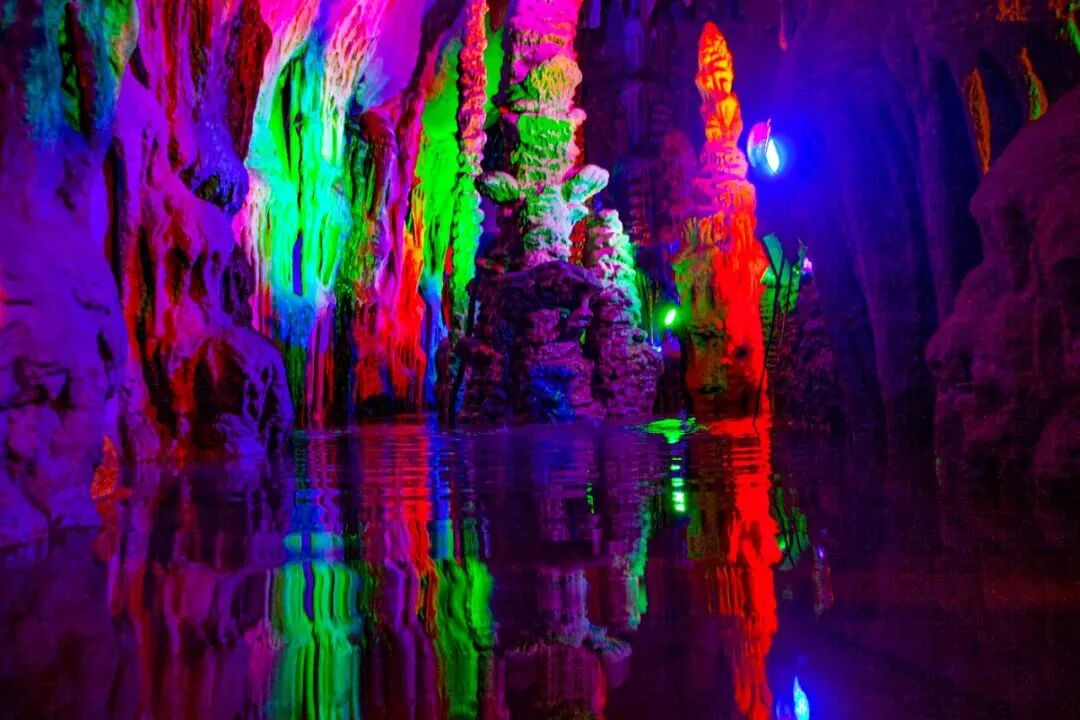 洞内流水潺潺,灯光将千姿百态的钟乳石、石笋、石花、石云、石钟、石剑照射的五彩斑斓。