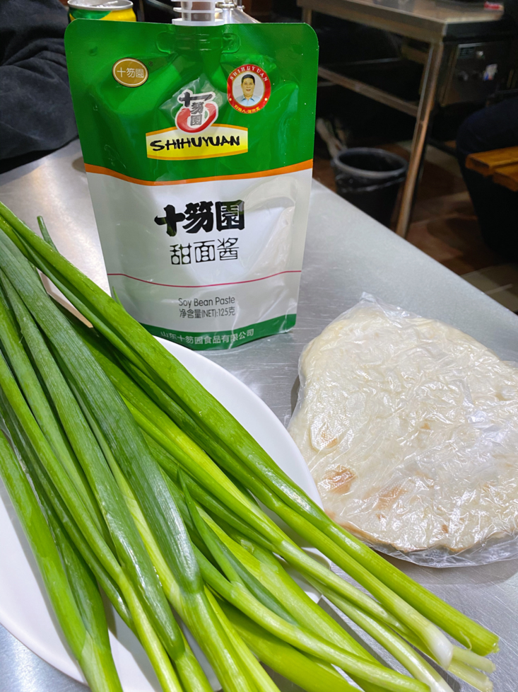 拿一根小葱,蘸一口甜面酱,与烤肉一起卷到小饼里,一口咬下去,油脂在口中炸裂,葱香和甜面酱的鲜味,都在刺激着你的味觉神经……