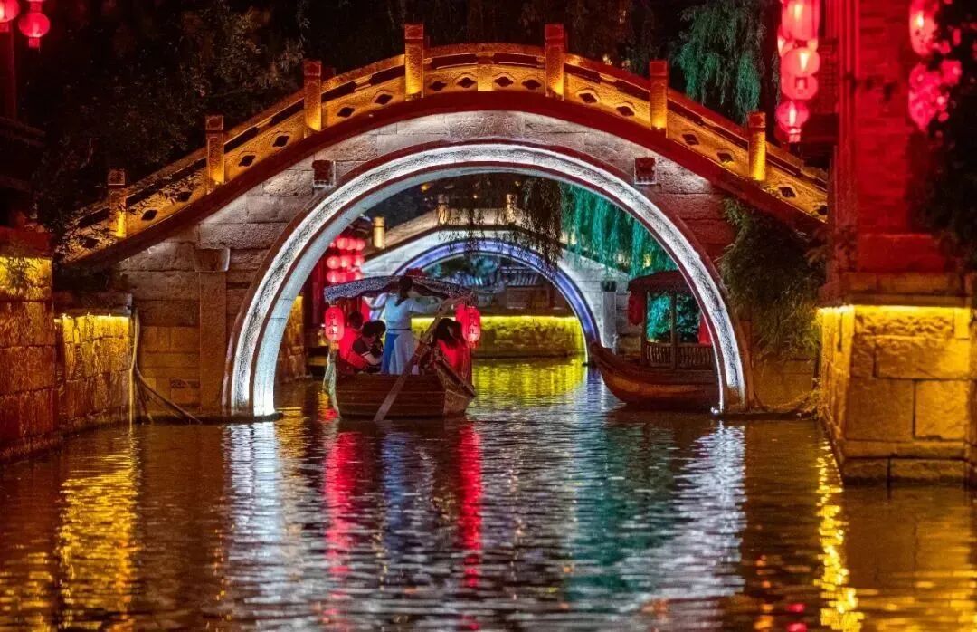 在灯火阑珊,热闹非凡的夜晚,坐上摇橹船穿梭在运河之中,灯光倒影在河面上,感受它独特的魅力和古朴风韵。许是星星醉酒,跌落银河,真想在古运河的船头大梦一场。