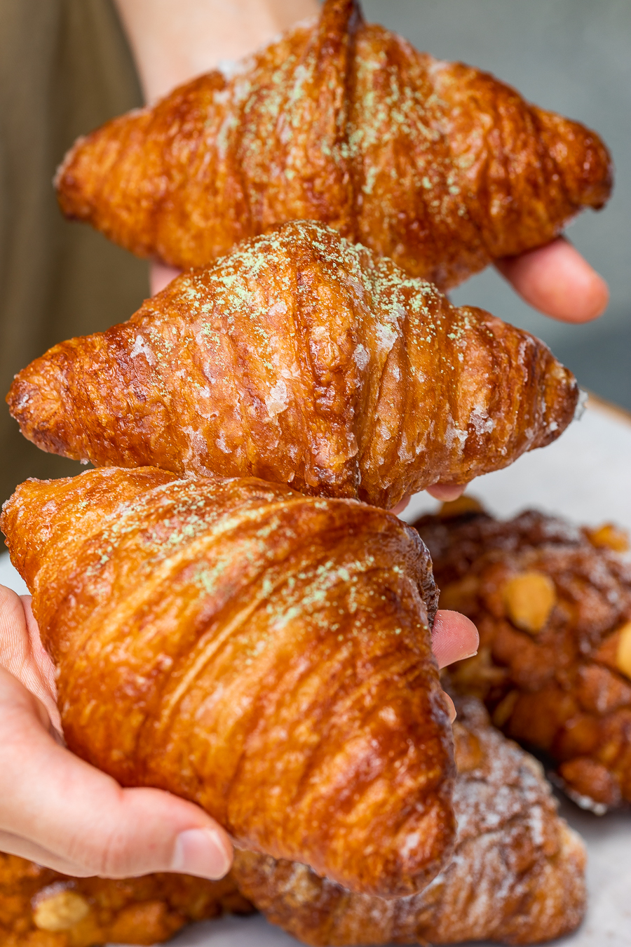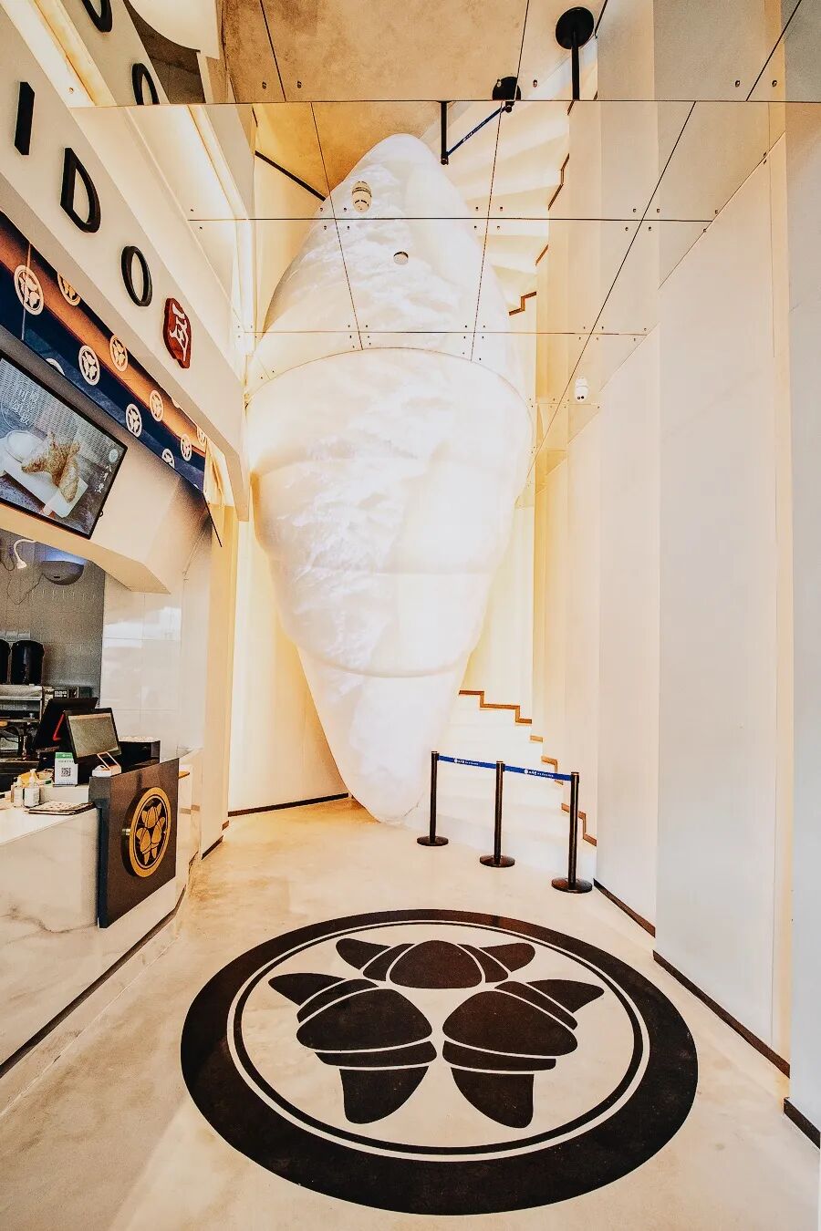 他家每颗可颂,面团需与天然牛油以黄金比例结合,与自创的64摺层工艺制作,且面团全部由台湾调配好运送来,每一只的大小高度都有统一标准,制作工艺非常复杂。同时因为独家的叠层手法与延压工艺,产出的可颂也会自带蜂巢结构,这就是他家招牌可颂名为蜂巢可颂的原因。所以每款可颂都需匠心制作,20分钟出1炉,卖完一炉出一炉。