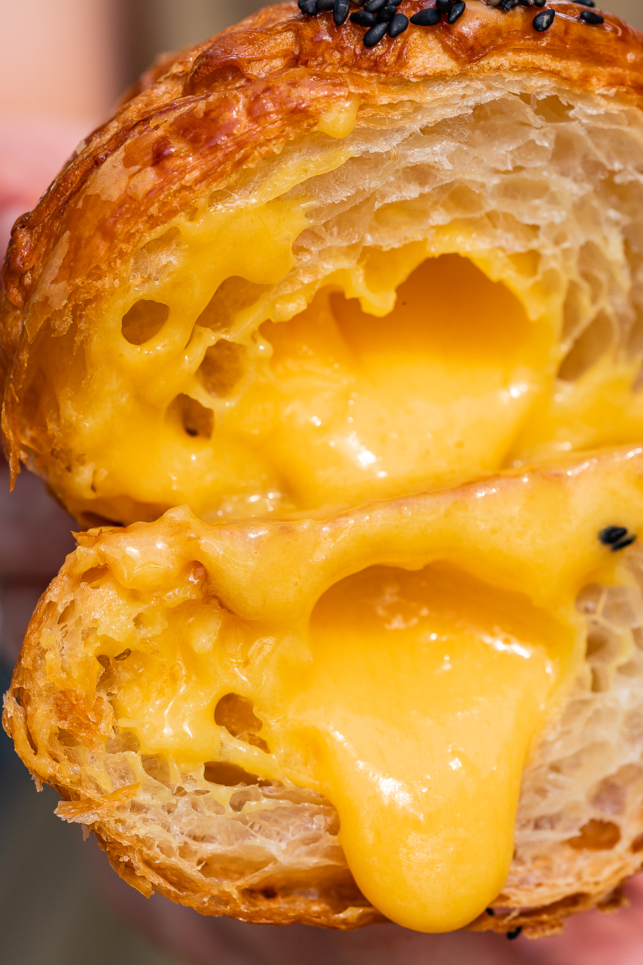 可颂每日现场烘烤,由于排队的人太多,所以每人每次限购6个哦,想买多就只能重新再去排队。croissant croissant croissant croissant店里的可颂,皆是由原味的蜂巢可颂制作。因为选用日本百年大厂面粉发酵,所以质地细致,内芯的口感会更松软。发酵好的可颂,会淋上一层独家特调酱。再放入榛果烘烤,吃时会有很浓郁烘烤后的黄油香,外层酥皮略微有些马卡龙口感,yep,这也是他名字的来由。croissant croissant croissant croissant流沙一直是深圳人团宠。金沙口感的可颂虽然常见,但抵不住粉丝就是多。蜂窝切面湿软又有韧劲,制作时师傅会从底部注入超满流沙,微微掰开,流沙就如像岩浆流入,为此本人还弄脏了一双鞋,我恨。croissant croissant croissant croissant【松露白酱蟹肉棒可颂】可颂“开膛”后,师傅会将蟹味棒放上芝士,用炙烤寿司一样的手法制作,最终混合松露白酱一起放入可颂中,是少见的咸味可颂。