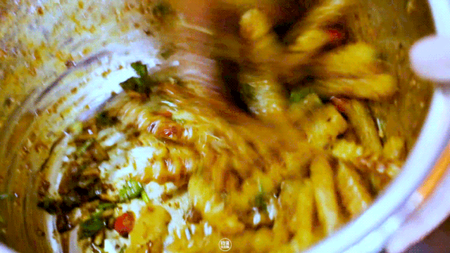 入夜后美食街上的人群越来越多,忽然发现很多人手上都捧着一份小吃,走进一看原来是狼牙土豆。香脆的炸土豆配上辣椒面,的确是逛街时过过嘴瘾的最佳选择。
