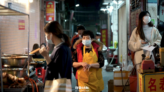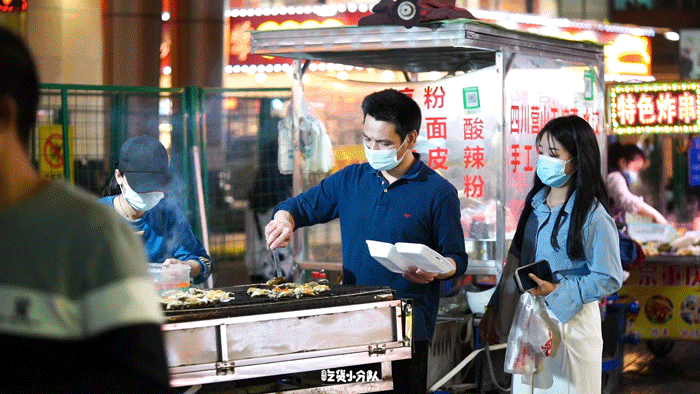 入夜后,街上的人群越来越多,特殊时期大多数人们都会选择打包带走,但也不乏约上好友小酌两杯的人群,街道旁此起彼伏的叫卖声,符合路人穿梭的喧闹声,是属于长龙独有的烟火气。