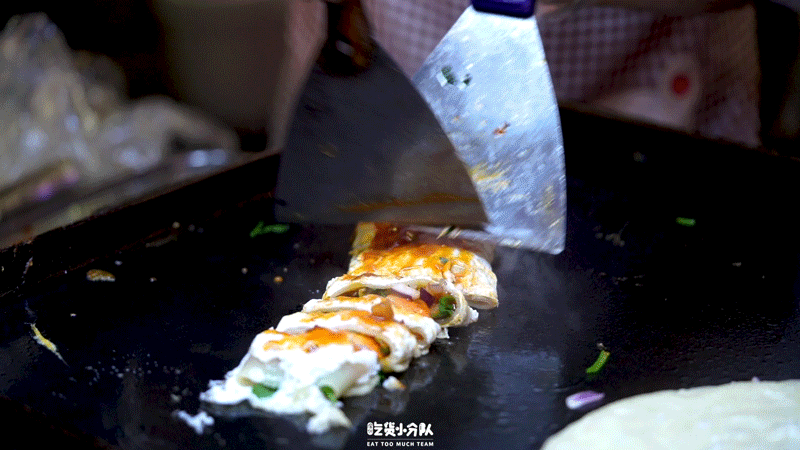 煎饼果子摊的阿姨是山东临沂的,跟摄影凯哥是老乡,所以就来帮衬一下。煎饼果子的面糊是用杂粮做的,所以比较浓稠,抹在锅上的时候,凯哥连忙说“对对对,我们老家的煎饼果子就是这样的”。他们家的煎饼果子分量挺大的,一般点半分就够了。