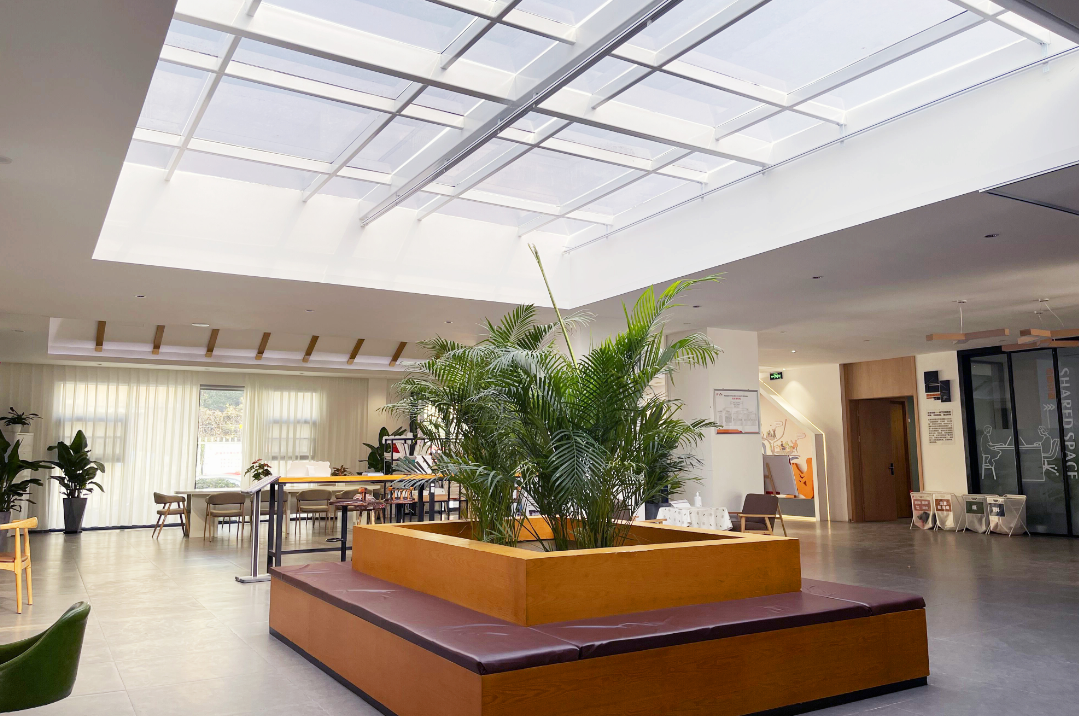 宽敞明亮的公共服务大厅也是居民议事的场地,环绕四周分布公共休闲座椅,是居民办事、交流、参与社区共治的共享地。