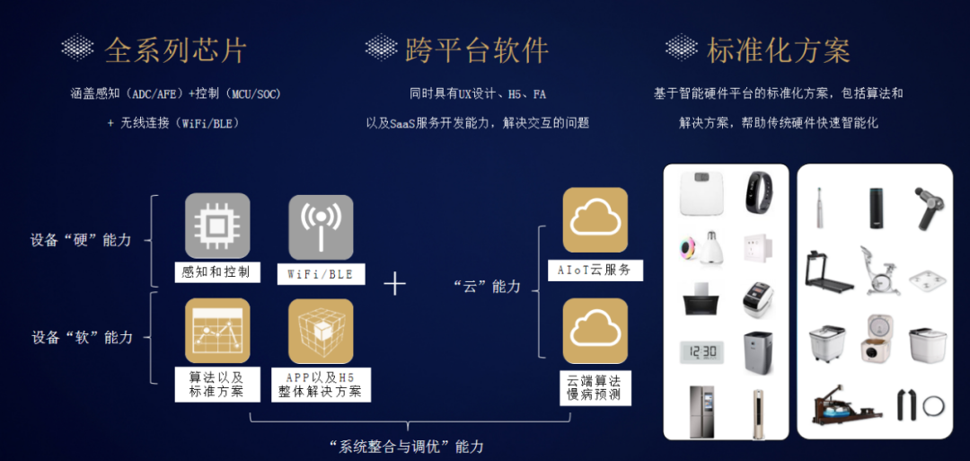 芯海具有打造细分领域方案整合和一站式解决方案的能力。以感知(ADC/AFE)和控制(MCU/SOC) + 无线(WiFi/BLE)为智能硬件平台提供基于智能硬件平台的标准化方案,帮助传统硬件快速智能化。同时具有UX设计、H5、APP以及SaaS服务开发能力,解决合作伙伴硬件智能化过程“软”的需求。