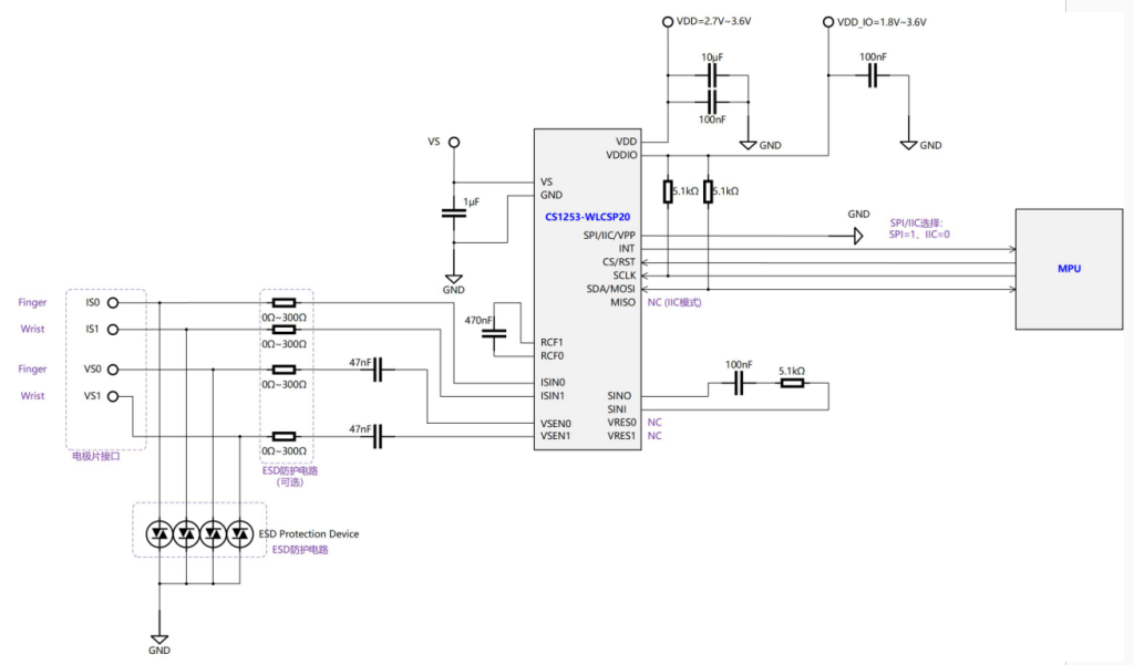 丰富的对外接口。CS1253支持SPI和IIC接口,其中IIC支持标准、快速及快速+全模式,SPI最大可支持4Mhz,IO管脚电压支持1.8V~3.3V,全方位助力智能穿戴式产品。