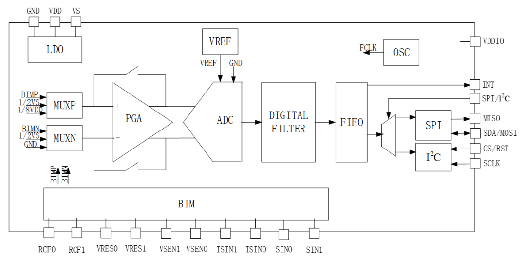 CS1253包括一个ADC信号链和人体阻抗测量模块(BIM)。其中,ADC信号链包括有输入MUXP/MUXN,可编程低噪声增益放大器(PGA)及一个Sigma-Delta ADC及数字滤波器Digital Filter。MUXP/MUXN具有3个内部输入通道,PGA和ADC具备多种增益选择,可支持多电极、多频率、多幅度的人体阻抗测量。