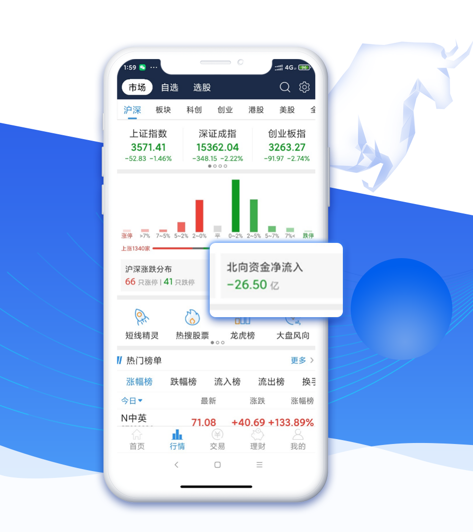 在e海通财移动端(需8.35以上版本)行情-市场页面即可找到北向资金专题页入口。