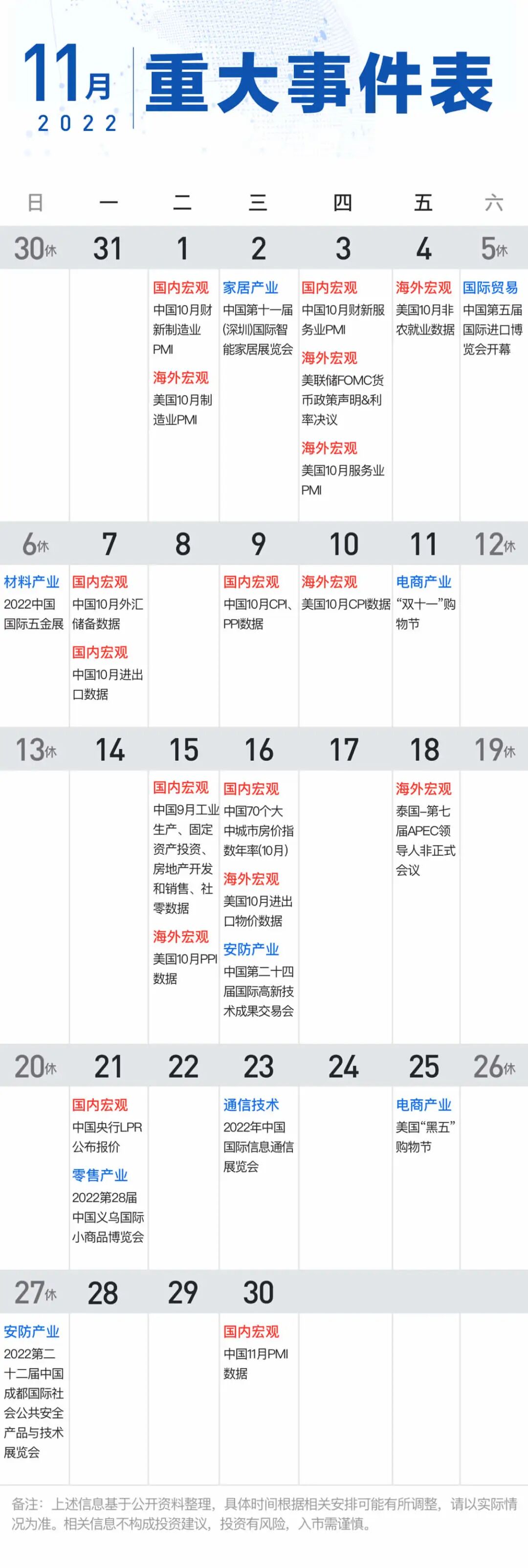 10月市场震荡下跌,各大指数均出现不同程度的调整,其中受北向资金大幅流出影响,部分权重股调整幅度较大。进入11月,外部方面,加息靴子有望落地,矛盾进入缓解阶段,市场获得喘息窗口期;内部方面,重磅会议传递多个积极信号,“大安全”、“信创”等新赛道或将崛起。在这个过程中,有哪些投资线索值得关注?又有哪些风险需要防范?快来看十一月投资线索攻略。01