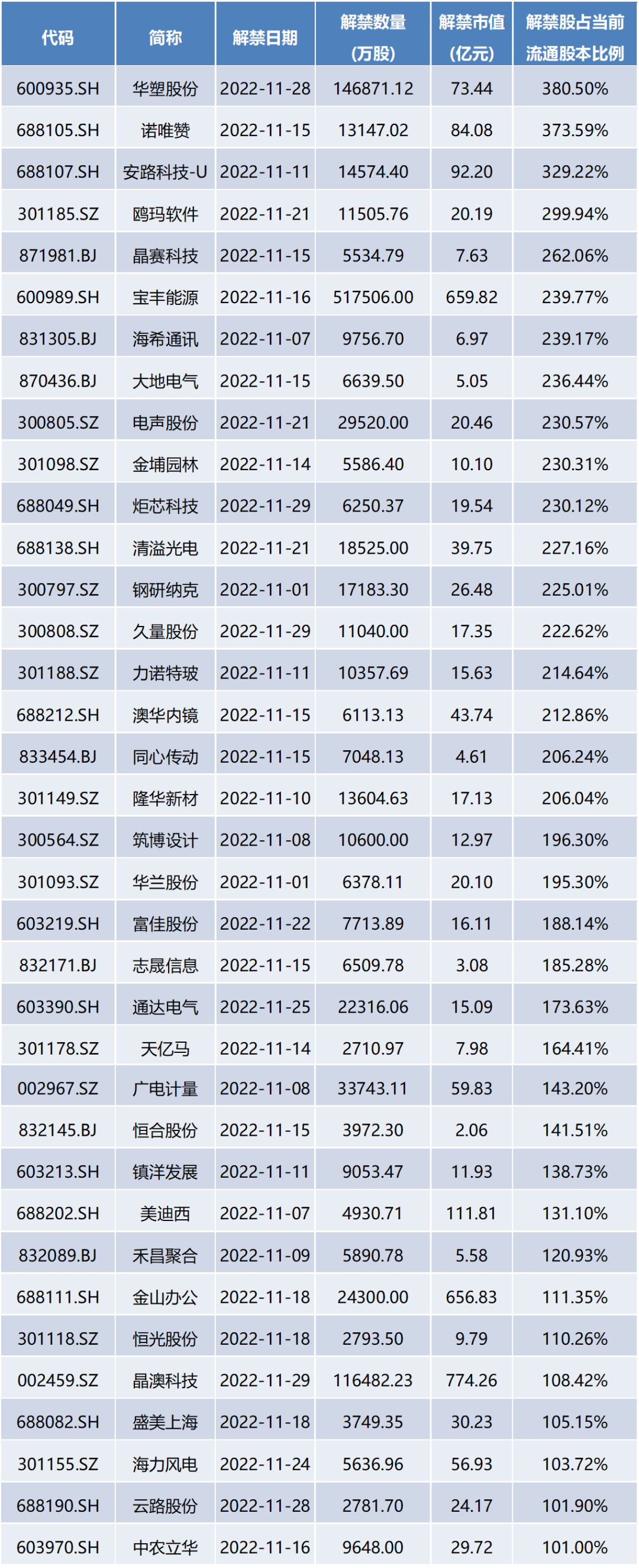 在资本市场,趋利避凶是每一位投资者的本能,但要提前识别风险并不容易。这里同样也梳理了一些近期可能存在的风险事件,供投资者参考。11月全市场解禁压力较10月有所提升。据统计,11月共计128家上市公司将迎来解禁,解禁市值约4243.20亿元,环比上涨127.27%。其中,将有15家上市公司解禁规模超过50亿,最高解禁规模774亿元,投资者需特别关注。下表列举了解禁股份数量占流通股比例高于100%的公司。与股票增持相对应,当上市公司大股东实施股份减持,且如果未能对减持行为提供合理的解释,通常会被市场解读为利空。依据公开市场信息,10月共计254家上市公司出现股东减持,下表列举了减持金额最高的前20家上市公司。特别说明:以上数据来源于WIND信息终端,均为公开客观信息,由海通盈投顾团队整理。相关信息仅供投资者参考,不构成投资建议。投资者据此做出投资决策所形成的结果需自行承担。免责声明:市场有风险,投资需谨慎。本文所载内容仅供海通证券股份有限公司的客户参考使用,客户须自主做出判断和投资决策。如本内容为海通研究所发布的报告摘要,则仅为其研报观点的简要表述,客户仍需以海通正式发布的完整报告和专业的投资顾问的解读为准。