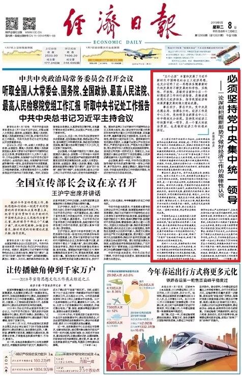 新时代风云激荡,中国经济行进在具有许多新的历史特点的伟大征程中,机遇和风险同在,发展与挑战并存。推动改革发展、建设现代化经济体系、振兴实体经济、防范化解风险的任务重、难度大,正处于攻坚克难的重要时刻。越是在这个时候,越是要强化政治意识、增强政治定力、坚定政治立场,越是要加强党中央对经济工作的集中统一领导。如果否定或者削弱党中央的集中统一领导,势必出现各自为政、一盘散沙的局面,将会带来灾难性的后果。