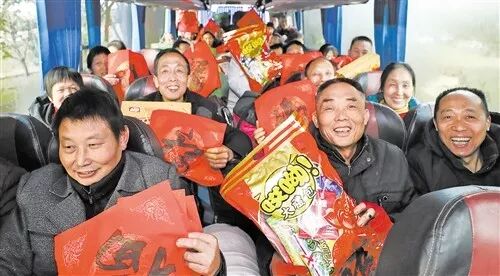 1月26日,浙江省德清县钟管镇升华集团华源颜料有限公司外来务工人员开心地在车上拿着福字返乡。自2002年开始,为解决外来务工人员回家过年买票难、乘车难的问题,公司免费为员工提供春节往返的包车,为他们创造舒适温馨的回乡之旅。(中经视觉 王 正摄)