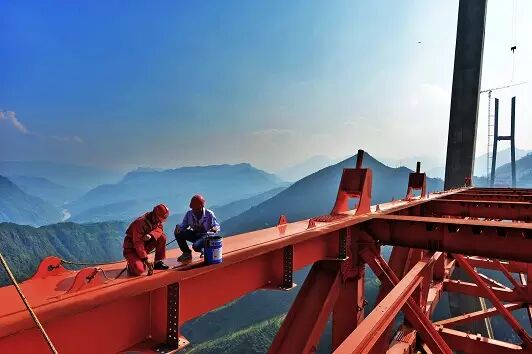 ↑“背靠万重高山,修筑千里坦途”,建设者在杭瑞高速公路毕节至都格段北盘江大桥上施工。