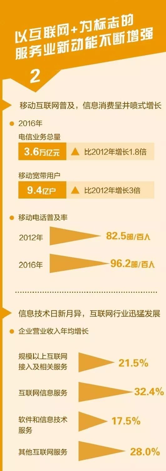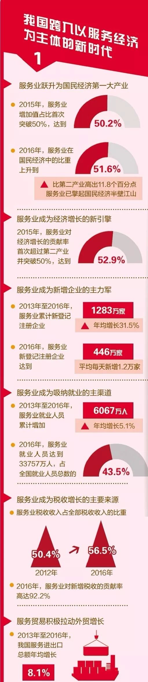党的十八大以来,我国服务业发展取得一系列新进展和新突破,占据了国民经济的半壁江山,新兴服务行业和业态大量涌现,助推传统产业转型升级,服务贸易规模不断扩张,吸引外资和对外投资取得新突破。5年来,服务业在优化结构、提高质量、促进就业、拉动消费、改善民生等方面发挥了重要作用,成为拉动国民经济增长的主动力和新引擎。