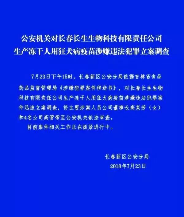 7月23日下午15时,长春新区公安分局依据吉林省食品药品监督管理局《涉嫌犯罪案件移送书》,对长春长生生物科技有限责任公司生产冻干人用狂犬病疫苗涉嫌违法犯罪案件迅速立案调查,将主要涉案人员公司董事长高某芳(女)和4名公司高管带至公安机关依法审查。