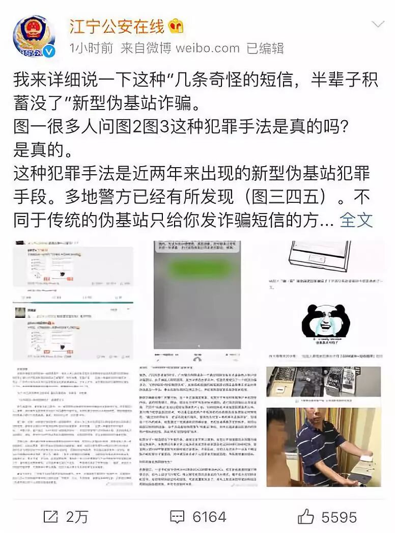 但是从网友爆料的情况来看,这一类团伙目前仍然存在。据微博@江宁公安在线说,此类新型伪基站诈骗使用的方法是钻了手机信号协议的空子,对于普通用户来说基本上是无法防范的,也给警方的侦破工作带来了很大的挑战!