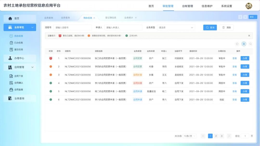 农村土地承包经营权网签管理系统面向各级农业农村业务部门、管理部门提供合同网签审批办理服务。实现农户承包合同业务的申请受理、审核审批、业务办理、业务查询以及延包管理。农村土地承包经营权信息应用平台包括农村土地承包经营权网签管理系统、土地承包网签办理APP(农户端)、土地承包网签管理APP(管理端)、农村土地承包经营权信息台账管理系统和信息维护系统5个子系统。