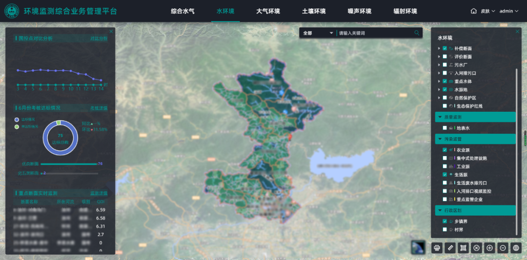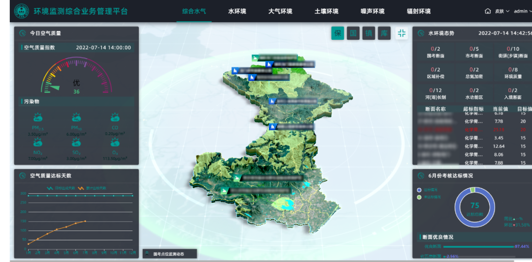 建设综合监察管理子系统,建立完善的大气、水环境7*24小时监测预警机制,实现对大气环境质量、水环境质量的监控管理。大气环境质量精细化管理决策主要基于已建大气污染防治综合立体感知监控体系,综合分析外部传输及本地污染源对区域的影响,为区域大气环境精细化管控提供系统科学的决策支持,包含大气环境动态监控、大气环境决策分析、基础数据管理等;水环境质量监控管理主要基于水质数据管理、超标预警、污染源集成等多维度分析体系,形成河流水质状况实时展示、水污染报警、数据统计分析、报告报表查询等功能。