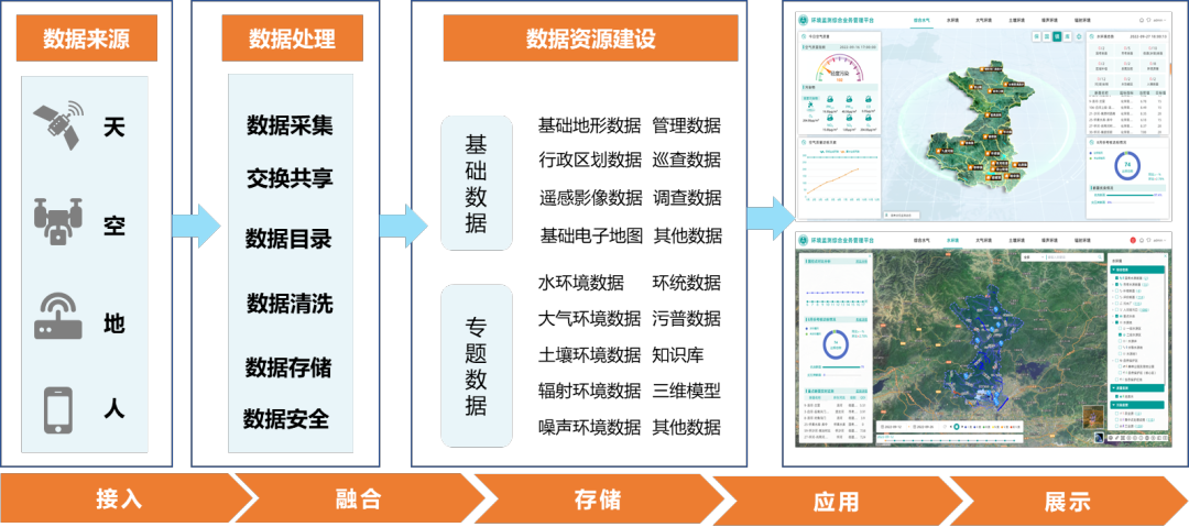 建立数据资源中心,为业务系统的运行提供数据支撑,基于国产化高性能GIS平台,结合云计算、虚拟化和高性能计算等技术手段,整合、交换和分析海量的跨地域、跨行业环境信息,实现海量存储、实时处理、深度挖掘和模型分析,实现“更深入的智能化”。依托各类数据资源,支撑环境质量演变、污染物扩散进行预测、分析和评价等应用场景,为区域环境污染治理及重大活动保障提供科学支撑。制定环境数据中心标准集,形成数据资源目录体系,实现区域环保数据的规范储存与管理。数据资源中心的建设,一方面需要搭建GIS基础支撑环境,另一方面需要开展数据的预处理、数据整合入库、数据交换等工作。