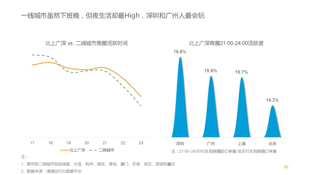 在当前许多企业实行“996”工作制度的情况下,夜间经济逐渐成为大城市的主要经济收入。根据滴滴出行2017年城市交通出行报告显示,北上广深等一线城市的下班时间普遍较晚,但是夜生活的时间也相应延长,各商圈的夜间活跃度普遍较高。