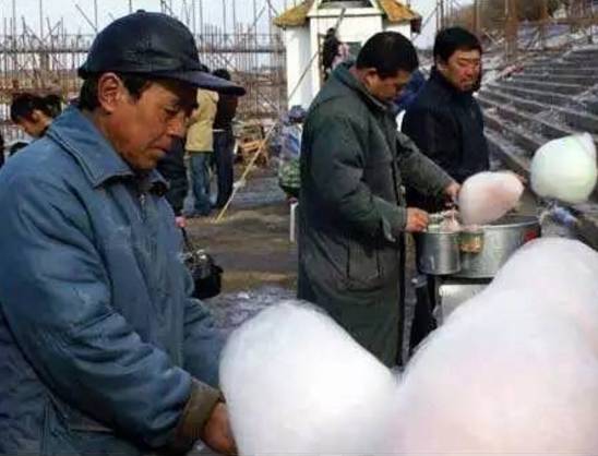这是7、80年代,街边的小贩正在加热白糖做成松软的棉花糖, 棉花糖是那个时候最不可思议的小吃,5分钱一团,一勺糖做一团棉花,甜甜的。
