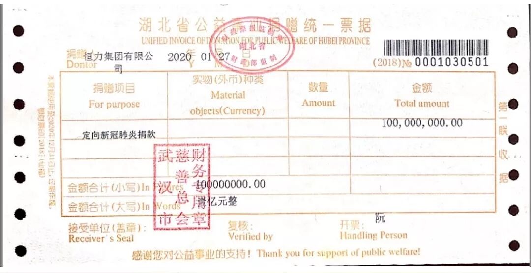 2020年1月27日,恒力集团向武汉市慈善总会捐赠1亿元人民币,专门用于武汉疫区新型冠状病毒肺炎防治工作。据悉,该笔捐款已用于建设武汉火神山医院。