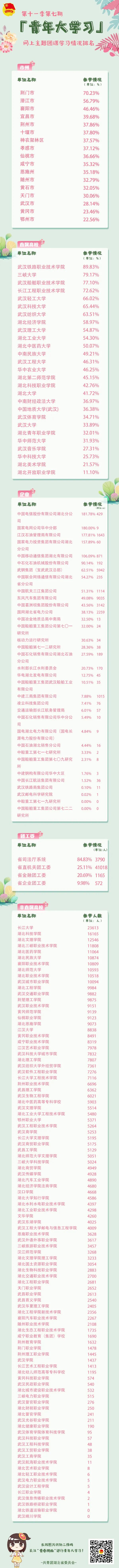 在直属高校团组织中,武汉铁路职业技术学院、三峡大学、武汉船舶职业技术学院、长江工程职业技术学院、武汉轻工大学的参学率排名位居前列。