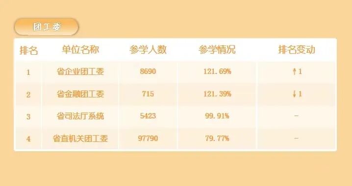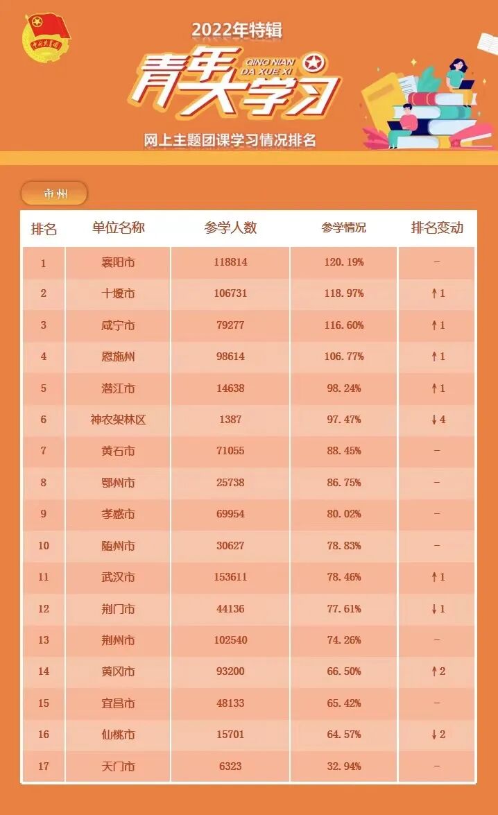 上一期网上团课,在市州团组织中,襄阳市以参学率120.19%领跑排行榜,十堰市、咸宁市、恩施州紧随其后,参学率均超过100%。