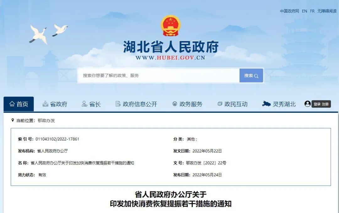 5月24日,湖北省人民政府办公厅印发《关于加快消费恢复提振若干措施的通知》,提出我省今年将通过发放消费券,报废旧车并购买新能源汽车补贴8000元,合理调整住房公积金贷款首付和额度,在允许临时占道经营的道路夜间摆摊免收场租费、摊位费、垃圾处理费,落实最低工资标准制度,对承租行政事业单位和国有企业(包括国有全资、控股和实际控制企业)房屋的服务业小微企业和个体工商户减免3个月租金、位于疫情中高风险地区所在的县级行政区域内的减免6个月租金等18项举措,加快促进消费回补和潜力释放,发挥消费对经济循环的牵引带动作用。